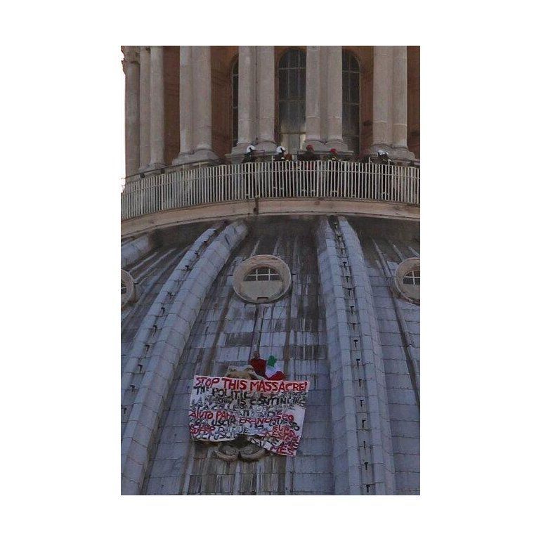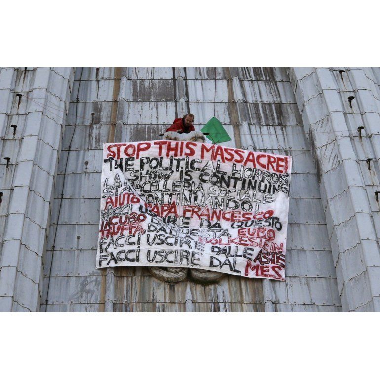 Un hombre se trepó hoy a la cúpula de la basílica de San Pedro del Vaticano, en donde desplegó una pancarta con frases sobre la crisis económica y contra el euro.
