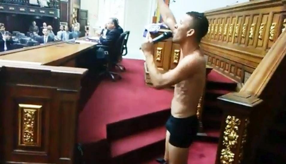 El diputado venezolano Gilber Caro se quitó la ropa durante un debate en el Parlamento hasta quedar semidesnudo para protestar por las "torturas" que, según la Cámara, recibió el también legislador opositor Juan Requesens, acusado por el fallido atentado contra el jefe de Estado, Nicolás Maduro.