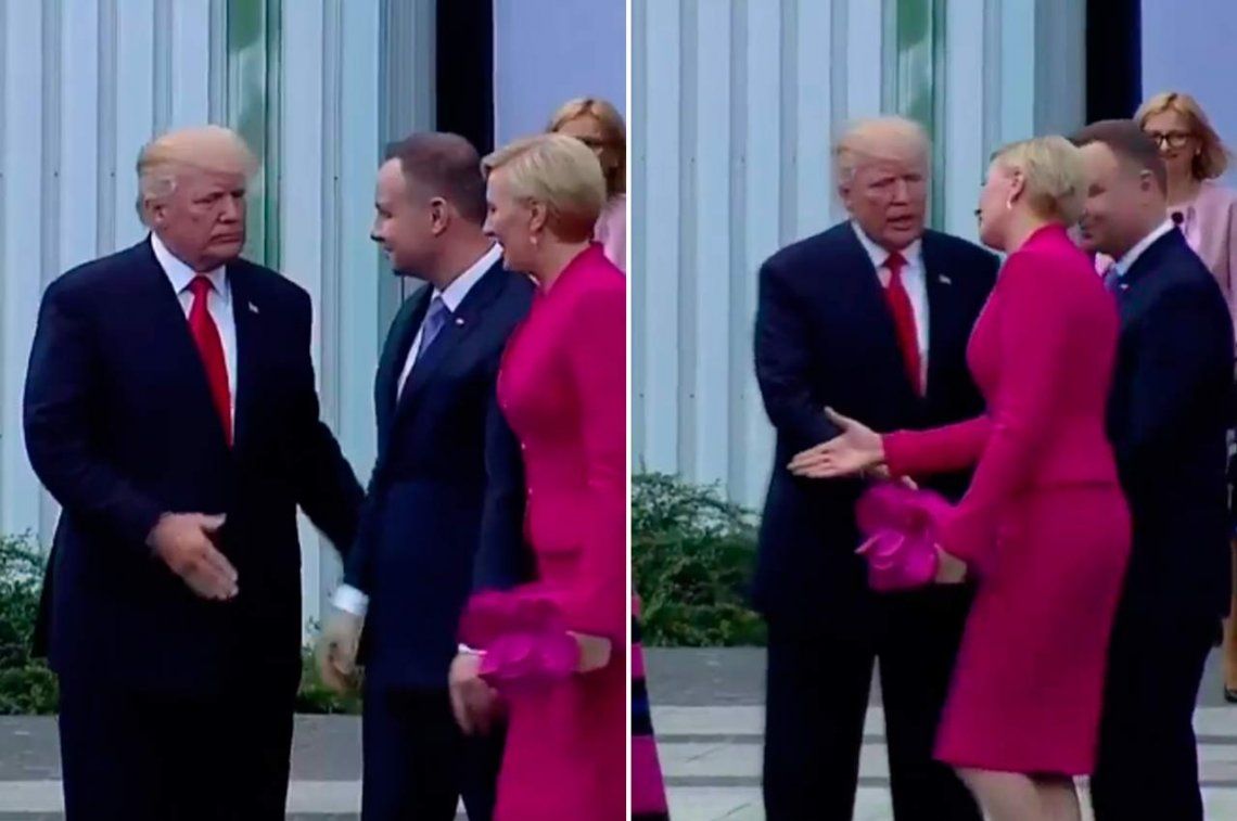 Fue en el primer encuentro entre ambos mandatarios cuando a Trump se volvió a “comer” un amague. Mientras el presidente norteamericano posaba para la foto junto a su par polaco y su esposa Agata Kornhauser, ésta última extendió la mano en señal de saludo pero la destinataria de la misma fue Melania Trump, que se encontraba a su lado.