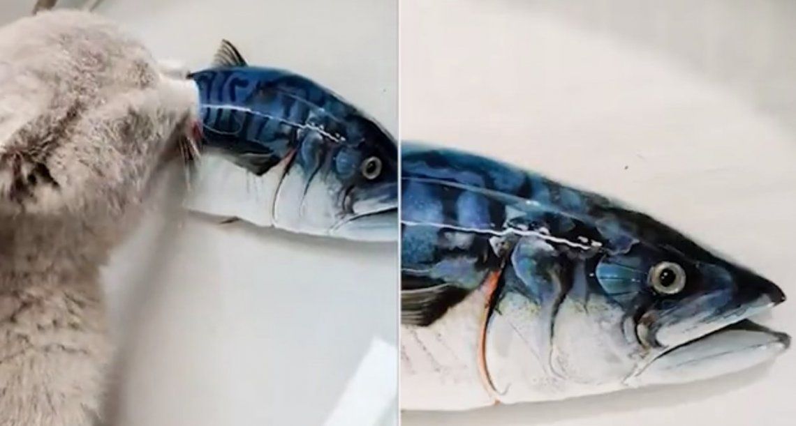El artista chino Ling compartió un tierno video en el que se puede ver como su gatito Mai Mai, de cinco meses, intenta comerse una de sus pinturas más hiperrealistas: la figura de un pez en 3D.