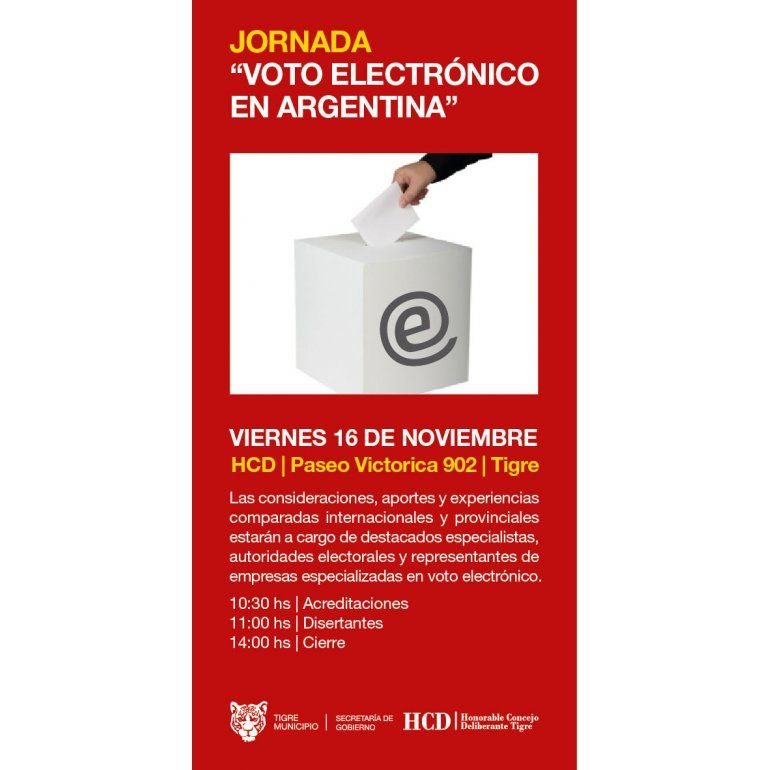 El Municipio de Tigre invita a la Jornada de “Voto electrónico en Argentina” a realizarse el viernes 16 de noviembre, a partir de las 11 hs, en el HCD del Municipio, en Paseo Victorica 902, Tigre.