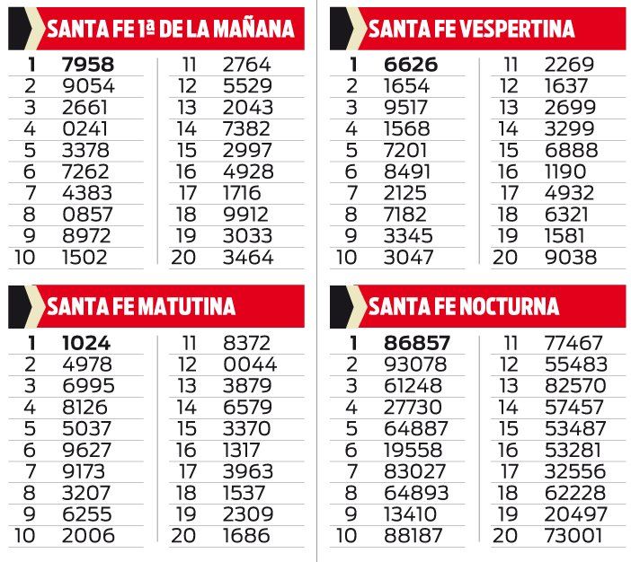 LOTERIA DE SANTA FE PRIMERA DE LA MAÑANA, MATUTINA, VESPERTINA Y NOCTURNA