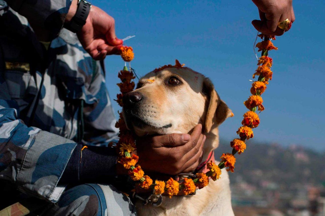 Los nepalíes agasajaron recientemente a los perros con guirnaldas y manjares, con motivo de la festividad hindú de Tihar, para reconocer la especial relación entre animales y humanos, tal y como manda la tradición.