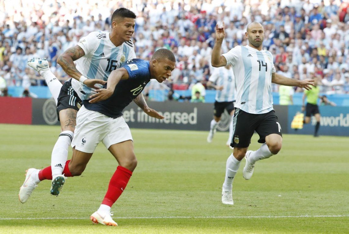 Después de que Ever Banega perdiera la pelota en mitad de cancha, Kylian Mbappé agarró el balón y tuvo una corrida a pura potencia. Ni Javier Mascherano, ni Marcos Rojo pudieron frenarlo sin falta. El central argentino lo golpeó y, finalmente,le cometió infracción.