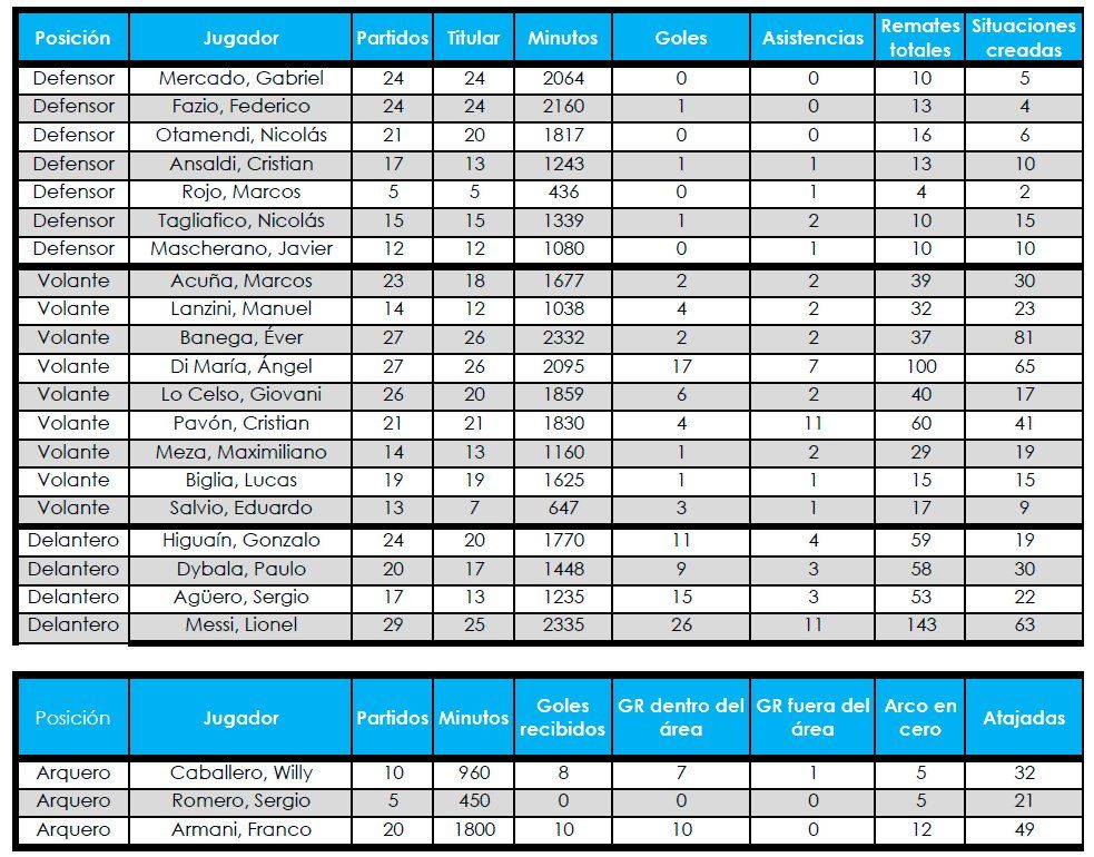 En esta nota te compartimos la cantidad de partidos disputados, minutos sobre el campo de juego y goles anotados (en el caso de los arqueros, los recibidos) de cada uno de los 23 elegidos por Sampaoli para disputar el Mundial en sus respectivos equipos en 2018