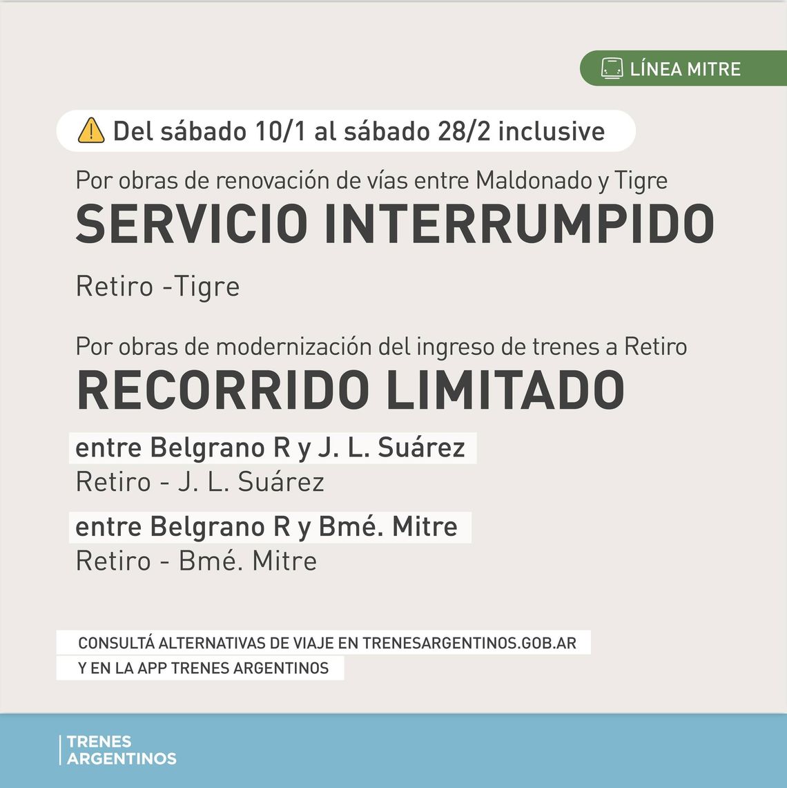 El recorte de los servicios del ramal José León Suárez de la Línea Mitre de Trenes Argentinos entre Retiro y Belgrano R, que durante diciembre y enero se anunció que se iba a prolongar por 7 semanas (3 de enero y las 4 de febrero) sumó una en marzo, y ahora agregará -en principio- otras dos, a raíz de pruebas del nuevo sistema de señalización en el ingreso a Retiro.