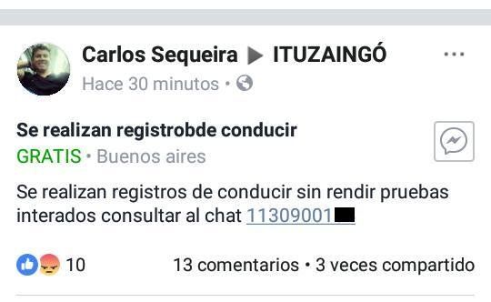 En la publicación de Facebook, Carlos Sequeira dejaba un número de teléfono para que los interesados se comunicaran con él. El área de Tránsito hizo uso ese dato público, llamó y pudo hablar con una persona que mencionó a una empleada municipal con funciones de inspectora en dicha área.