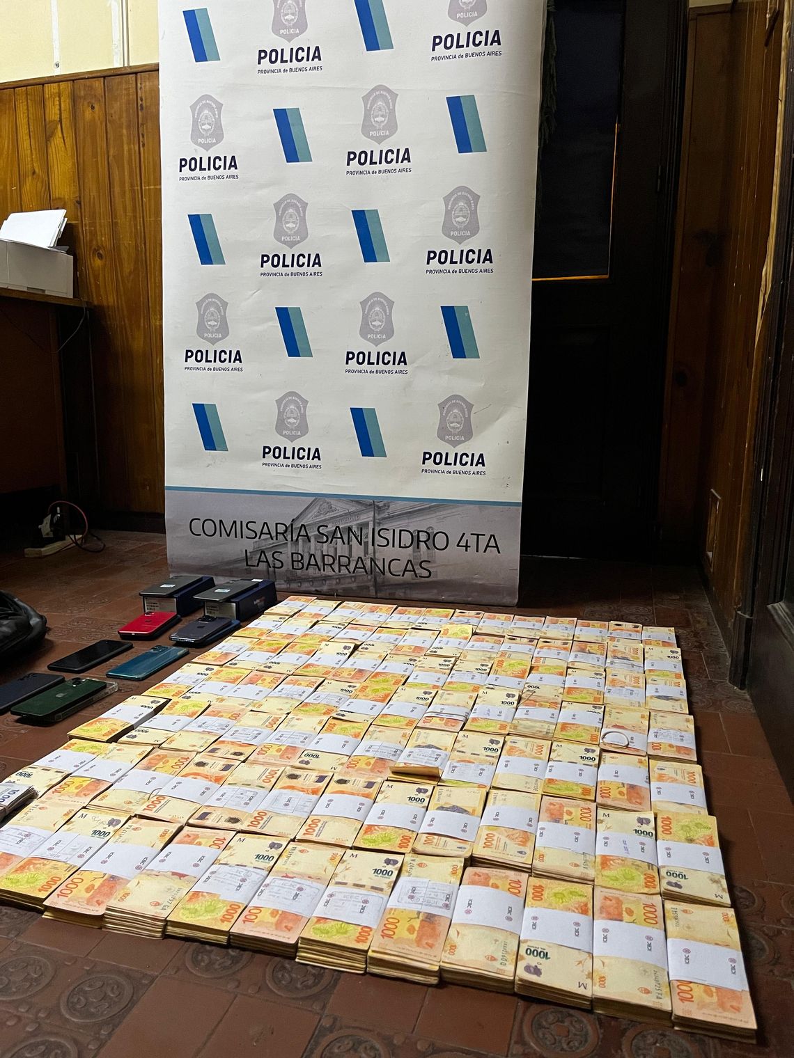 Cuando el Ford de color rojo pasó por el lector de patentes de San Isidro, el sistema de monitoreo del Municipio detectó que la chapa del auto tenía pedido de captura. Desde el Centro de Operaciones Municipal (COM) se dio inmediato aviso al personal de patrullaje que se encontraba en la zona y que finalmente logró interceptar el vehículo en Libertador y Justo José de Urquiza. Cuando revisaron el coche había 9 millones de pesos en efectivo y 8 celulares.