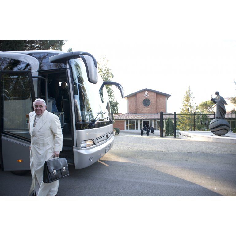 Tres horas después, el Papa partió del Vaticano con una delegación de 82 miembros de la Curia hacia el pueblito de Ariccia, en un gran micro y un minibús. Con su habitual estilo informal, el sumo pontífice, sentado en las primeras filas del autocar, saludó con la mano a los curiosos que se habían congregado ante las rejas para ver pasar al inusitado cortejo. Tras el Ángelus, el Papa pidió a la muchedumbre que rezara por él y por sus "colaboradores de la Curia Romana", que también se retirarán este domingo cerca de Roma para llevar a cabo ejercicios espirituales hasta el próximo domingo.
