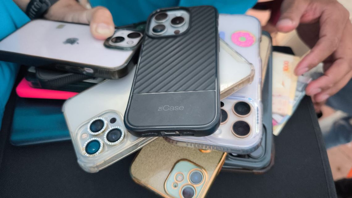 Durante la requisa, los oficiales encontraron en poder del hombre diez teléfonos iPhone de distintos modelos y colores, además de dos Motorola -un E13 azul y otro rosado- entre los que se hallaba el celular de la denunciante. Mientras se realizaba el procedimiento, otra mujer se presentó espontáneamente y reconoció uno de los aparatos secuestrados como propio.