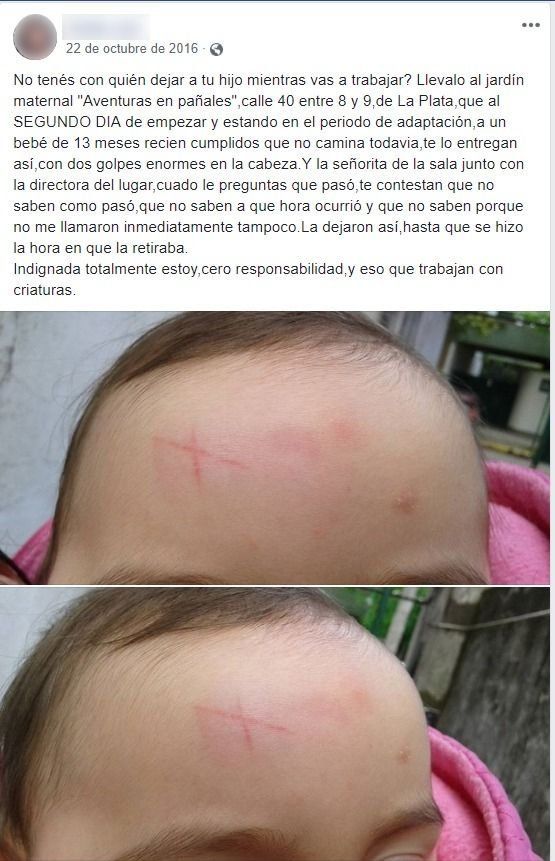 Además de este último video, se conoció la denuncia de otra madre que hizo en 2016. "¿No tenés con quién dejar a tu hijo mientras vas a trabajar? Llevalo al jardín maternal "Aventuras en pañales", en calle 40 entre 8 y 9 de La Plata. Que al segundo día de empezar y estando en el período de adaptación, a un bebé de 13 meses recién cumplidos que no camina todavía, te lo entregan así, con dos golpes enormes en la cabeza", escribió en Facebook. La mujer contó su historia y adjuntó imágenes de su bebé con golpes y lastimadura en su cabeza.