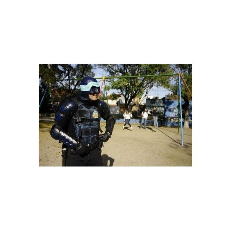 Utiliza un traje azul de superhéroe con luces de neón que tiene cierto parecido a personajes como Robocop, Batman y al Capitán América, incluso usa un escudo circular idéntico al de este personaje de historieta pero con los colores de la bandera argentina o el logo del club Lanús.