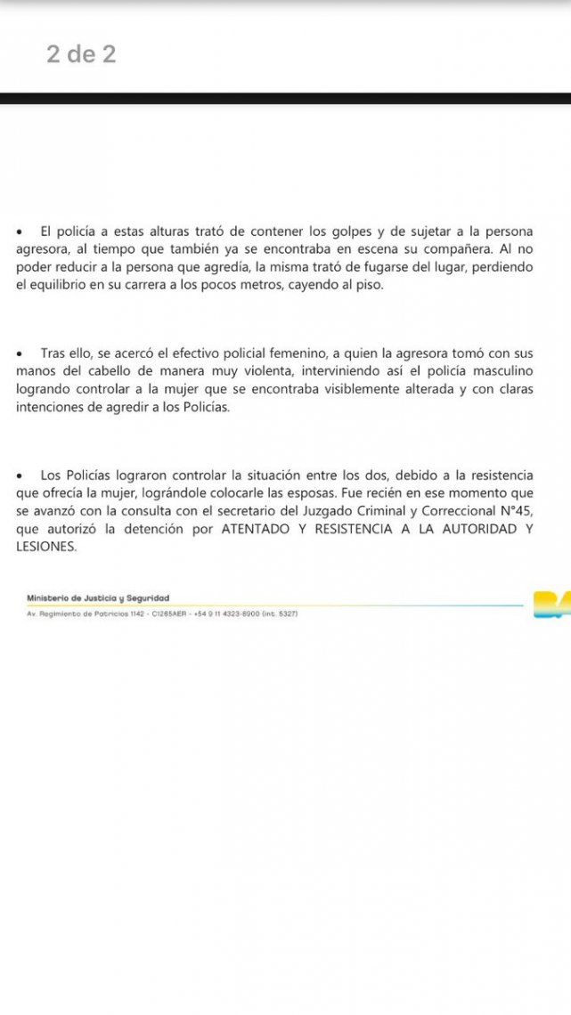 Ante la negativa, y siempre según la versión de la Policía de la Ciudad, cuando uno de los agentes se acercó para pedirle que cese con su actitud, “la mujer que se negaba a apagar el cigarrillo comenzó a lanzar golpes de puño contra el policía masculino sin motivo alguno, los que impactaron en la cara y el pecho”.