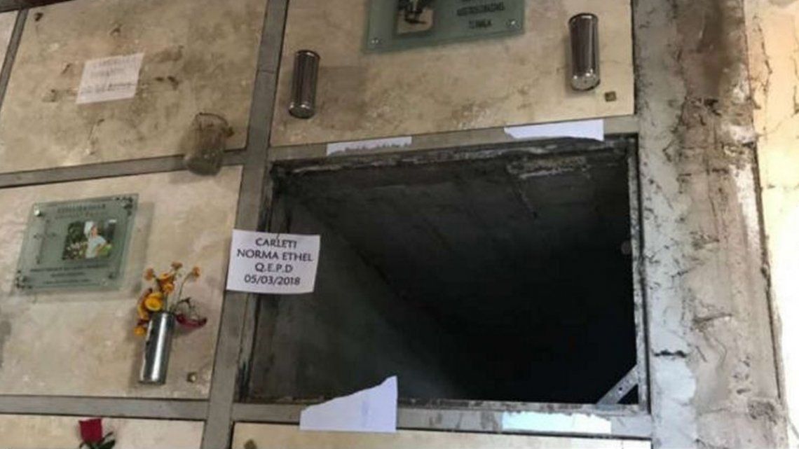 Dos sujetos encapuchados intentaron profanar el nicho, en el que fueron depositados los restos de la empresaria Norma Carleti, quien fuera asesinada a puñaladas en su casa de la localidad mendocina de Tunuyán, en un femicidio en el que se encuentran detenidos un padre y sus tres hijos como autores del crimen y el ex esposo de la mujer, un legislador provincia del radicalismo, como instigador del hecho.