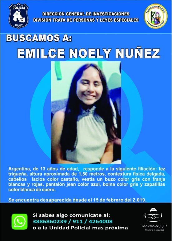 Una nena de 13 años está desaparecida desde el 15 de febrero en Jujuy. Su nombre es Emilce Noely Nuñez y sus familiares la buscan desesperadamente. Pertenece al barrio Cerro Las Rosas, de San Salvador de Jujuy.