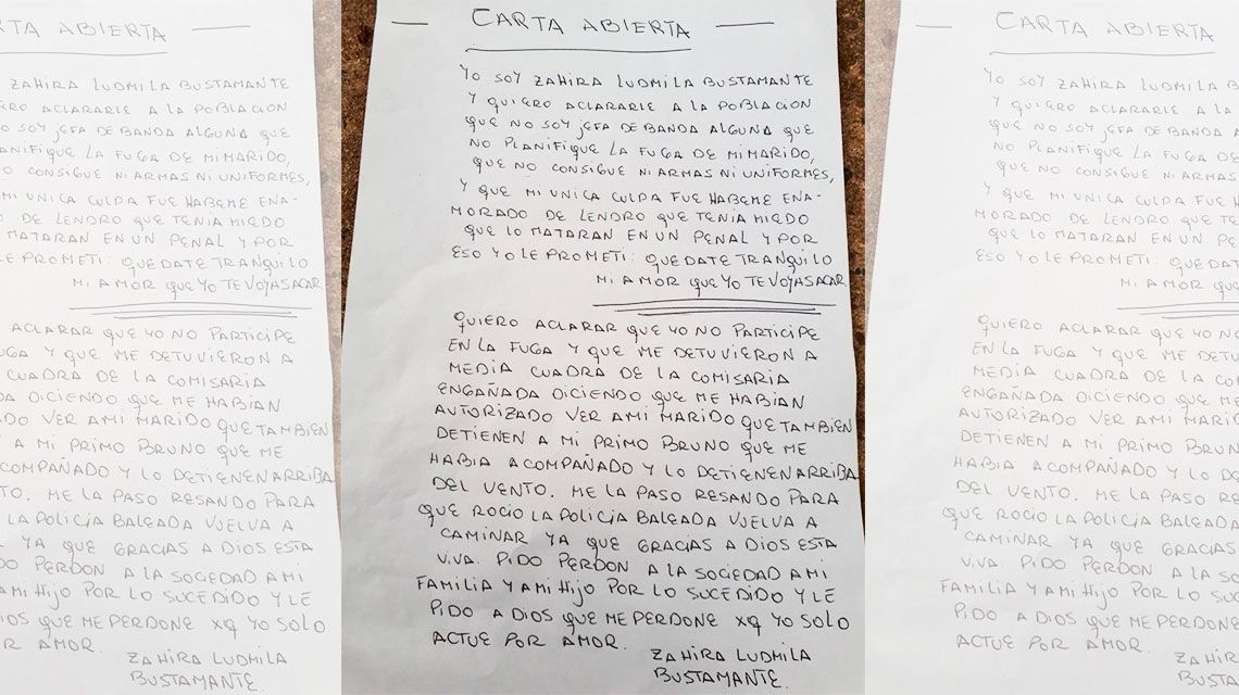Además, en la misiva, la joven dijo que ella no es jefa de ninguna banda y que no planificó la fuga de su pareja, a quien menciona como su marido.