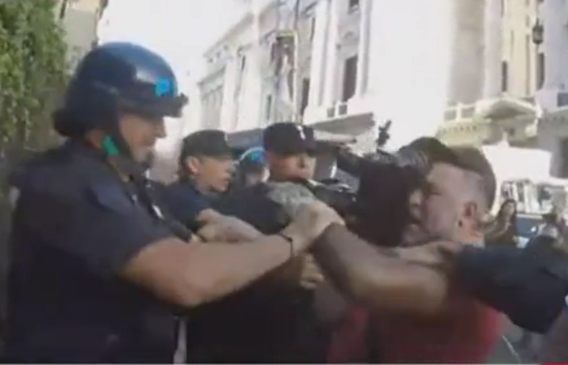 Un camarógrafo del canal A24 fue agredido y detenido este jueves por efectivos de la Policía Federal Argentina mientras cubría las protestas contra la modificación de la Ley de Glaciares en las inmediaciones del Congreso de la Nación Argentina.