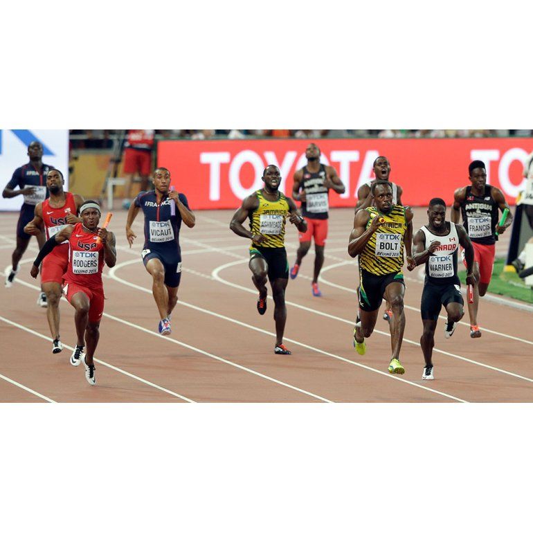 Usain Bolt volvió a hacer historia. Este sábado, el equipo jamaiquino de velocidad se impuso en la prueba de los 4x100 del Mundial de Atletismo y el mejor de todos los tiempos le dio forma a un nuevo triplete. Los caribeños se impusieron con un tiempo de 37s36", cuatro décimas por delante de Estados Unidos, que por una irregularidad en el pase de una de las postas fue descalificado. China y Canadá completaron el podio, al obtener las preseas de plata y bronce respectivamente.