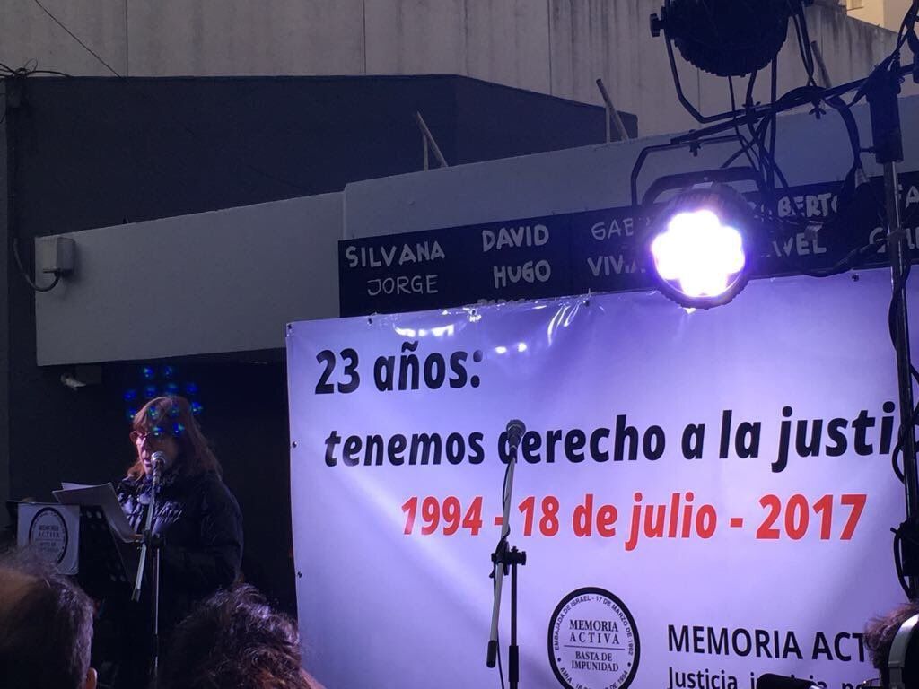 La dirigente de Memoria Activa afirmó que “a 23 años del asesinato de nuestros familiares y amigos en la AMIA, Memoria Activa vuelve a decir presente. Como cada año, decimos presente para denunciar la impunidad, esa impunidad que crece y engorda con cada acción e inacción de los responsables de investigar quién los mató. Y que sigue viva, y se expande, con cada acción e inacción de los que se encargaron del encubrimiento”.