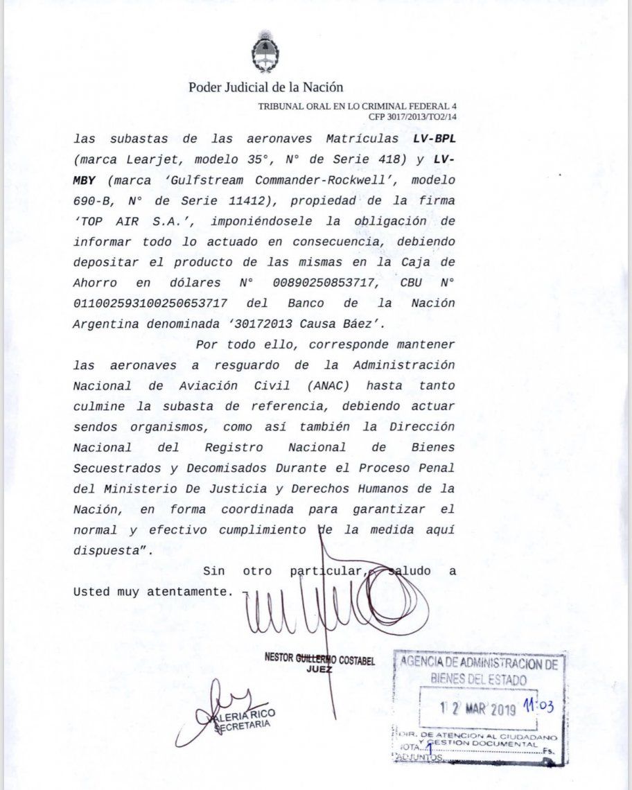 De este modo, el TOF 4 autoriza a la AABE a vender, a través de subasta pública, las dos aeronaves. El organismo del Estado deberá informar todo lo actuado y el dinero que se recaude irá a una cuenta del Banco Nación a nombre del número de causa que lleva "la ruta del dinero K".