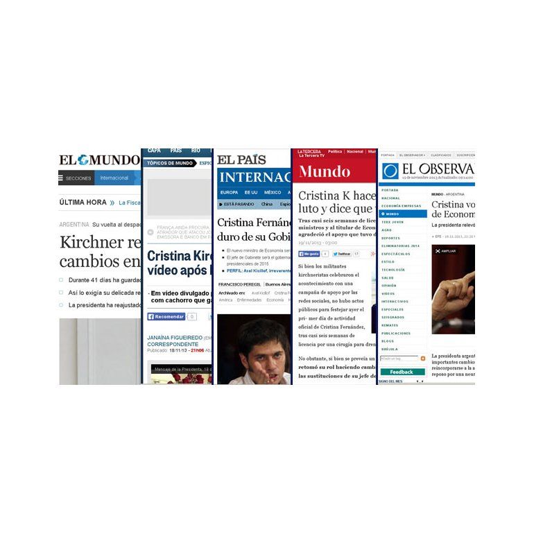 En tanto, el diario español El País lanza desde el título que Cristina Kirchner "refuerza el núcleo duro de su gobierno" con una reforma de gabinete que "afianza y fortalece" al sector "menos dialogante" del kirchnerismo.