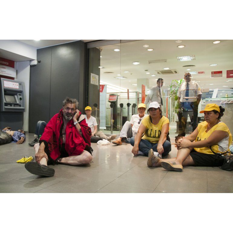En horas de la mañana de este lunes, el dirigente social y unos 50 integrantes del Movimiento Independiente de Jubilados y Desocupados (MIJD) ingresaron a la sucursal del Banco Santander Río ubicada en la esquina de Hipólito Yrigoyen y Balcarce y se instalaron en el hall.