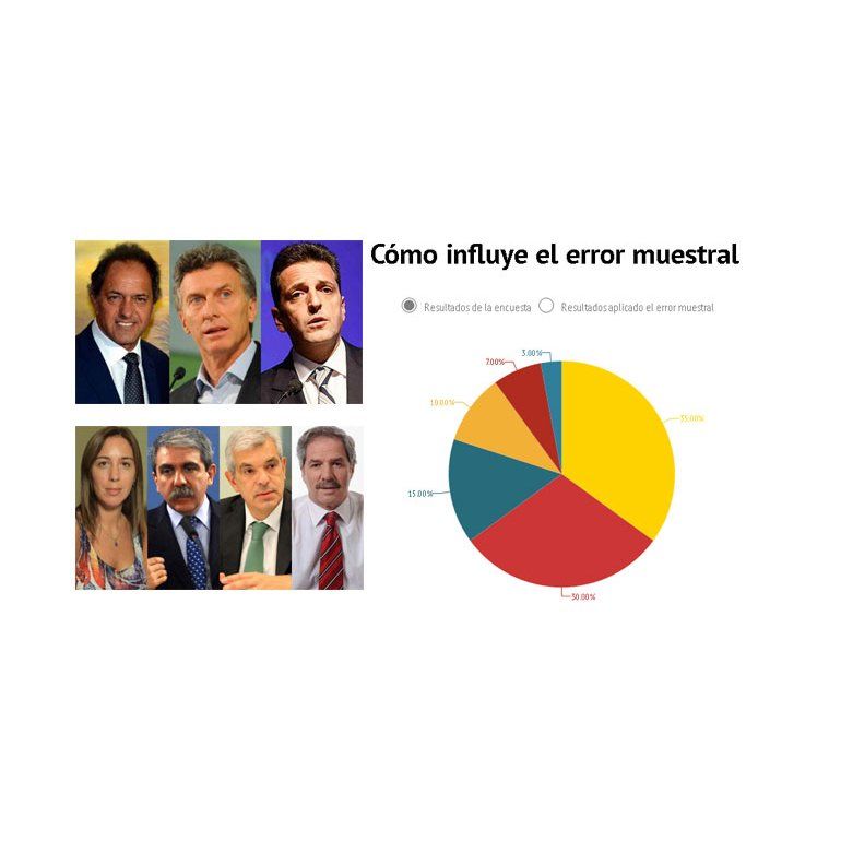 "Una encuesta no es un censo. No se entrevista a la totalidad de la población. Es un método falible, que se maneja por un margen de error", agrega Roqué. El margen de error determina el "mas/menos" de cada resultado: es fundamental para entender los números finales. Un candidato que arroja un resultado del 30% en un estudio confiable, cuyo margen de error es del 3%, en las elecciones reales rondará entre el 27% y 33%. Pero hay que saber leerlos. Si el candidato "A" mide 30% en un estudio con el 5% de error muestral, y el "B" da 27%, el análisis anticipa que el "B" puede ganar la elección.