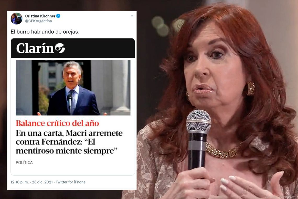 "El burro hablando de orejas", twitteó Cristina junto a una captura de la nota del diario Clarín en la que se hace referencia a la misiva que Macri subió este mediodía a sus redes sociales, en las que critica duramente los dos primeros años de la gestión de Alberto Fernández, a quien tildó de mentiroso.
