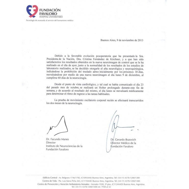 Respecto de la situación cardiológica de la mandataria, el parte indicó que se realizará "un holter prolongado durante este fin de semana y de acuerdo al resultado del mismo, el día lunes se reevaluará médicamente para determinar el ritmo de regreso a las tareas habituales".