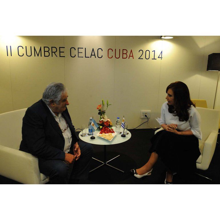 La presidenta Cristina Fernández de Kirchner mantuvo una reunión bilateral de media hora con su par uruguayo, José "Pepe" Mujica, en una sala del centro PabExpo donde se realiza la II Cumbre de la Comunidad de Estados Latinoamericanos y Caribeños (Celac).