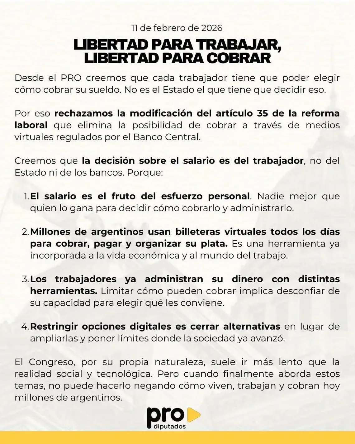 Otro punto que el PRO buscará reinstalar es la posibilidad de cobrar el salario mediante billeteras virtuales. El Senado eliminó esa opción del artículo que modifica la Ley de Contrato de Trabajo. Ritondo afirmó que insistirán para que el trabajador "pueda elegir cómo percibir su sueldo, sin restricciones que beneficien exclusivamente al sistema bancario tradicional".