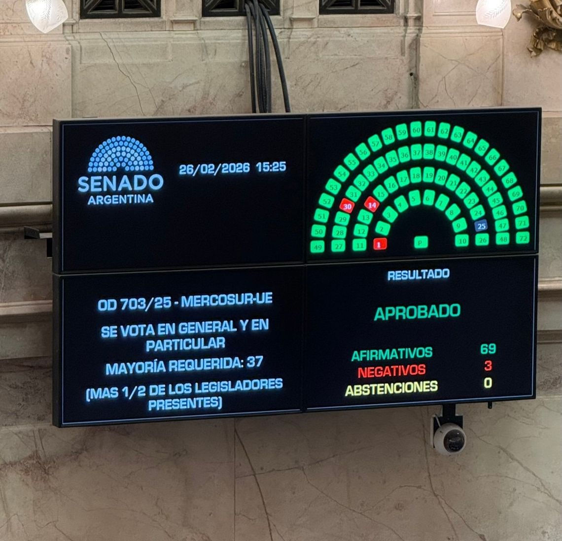 El Senado aprobó hoy el Acuerdo Provisorio de Libre Comercio entre el Mercado Común del Sur (Mercosur) y la Unión Europea (UE) que venía en revisión de la Cámara de Diputados.
