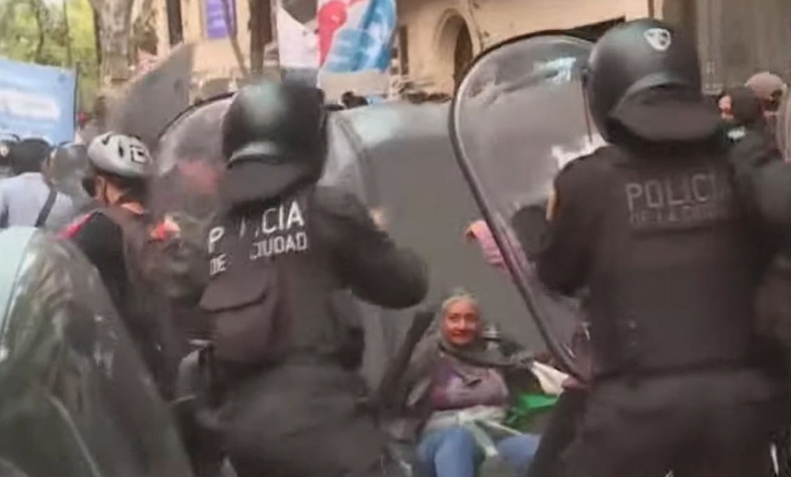 Los, uniformados de las fuerzas de seguridad empujaron y tiraron a una mujer en situación de calle contra un contenedor, la cual tuvo que ser atendida y también golpearon a algunos de los periodistas que cubrían la marcha.
