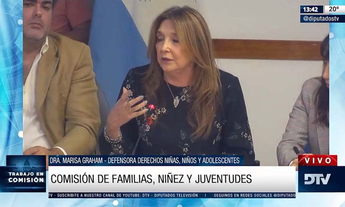 La defensora de los derechos de las niñas, niños y adolescentes, Marisa Graham, expuso este miércoles en la comisión de familias, niñez y juventudes de la Cámara de Diputados, que preside la diputada Roxana Reyes (UCR).