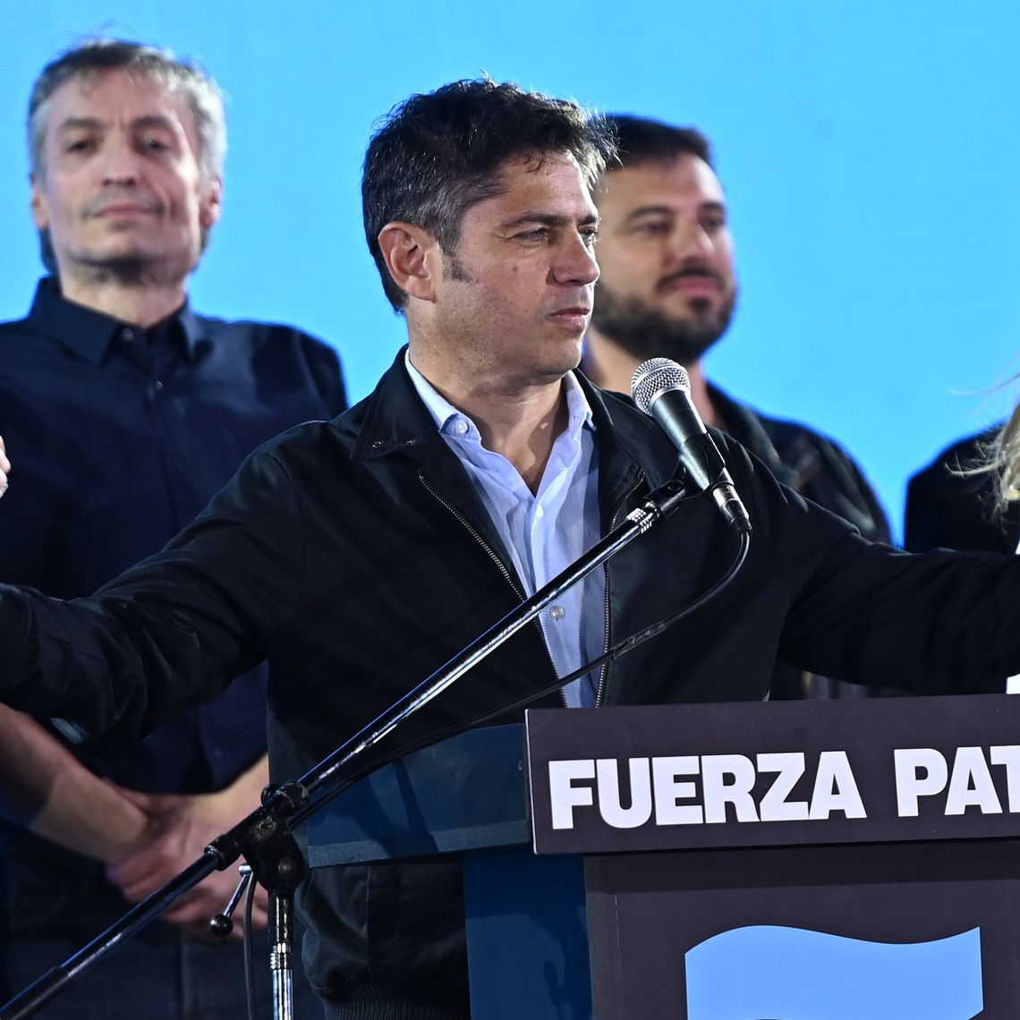 Kicillof estuvo acompañado en el búnker por los referentes Máximo Kirchner y Sergio Massa y por los diputados electos Jorge Taiana y Juan Grabois, entre otros.