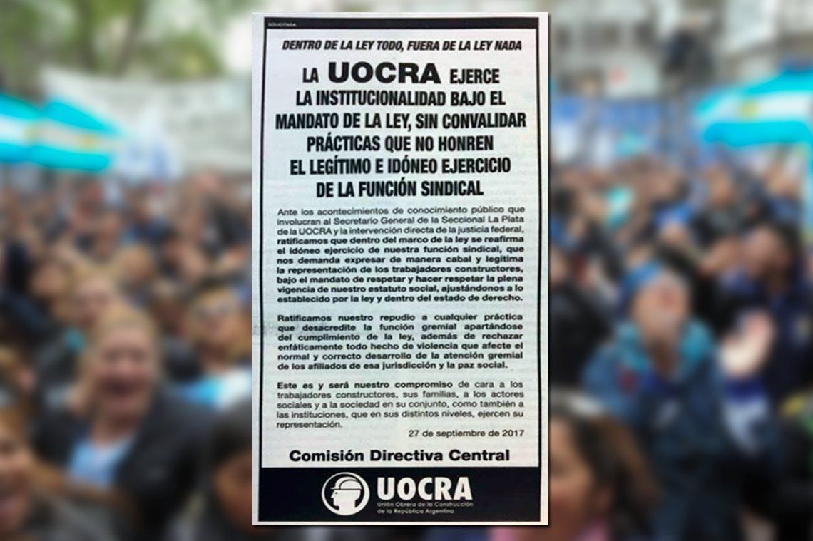 "Ante los acontecimientos de conocimiento público que involucran al Secretario General de la Seccional La Plata de la Uocra, y la intervención directa de la justicia federal, ratificamos que dentro del marco de la ley se reafirma el idóneo ejercicio de nuestra función sindical, que nos demanda expresar de manera cabal y legítima, la representación de los trabajadores constructores", comienza el texto, firmado por la Comisión Directiva del sindicato.