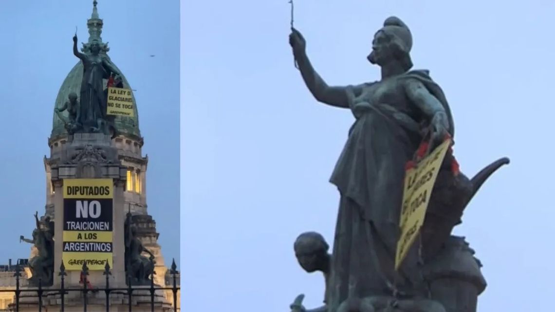 Un poco antes de las 7 de la mañana, nueve militantes ambientales saltaron las rejas de la plaza para subir a la escultura. Según mostraron las imágenes difundidas por medios, dos de ellos se colgaron con arneses e instalaron un cartel de la organización que decía: “Diputados, no traicionen a los argentinos”. Pocos minutos después, fueron detenidos por una orden de la Fiscalía.