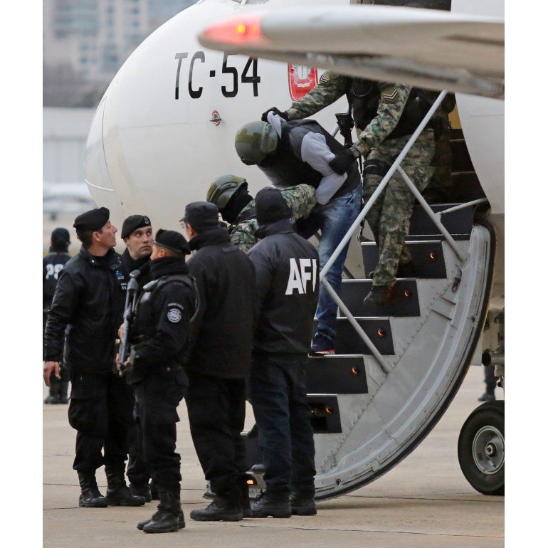 El detenido, que estaba prófugo desde 2012, arribó a la Base Aérea Militar Aeroparque (BAMA) a las 17.15, fuertemente custodiado por personal del grupo Alacrán de Gendarmería, con chaleco antibalas y protegido por escudos.