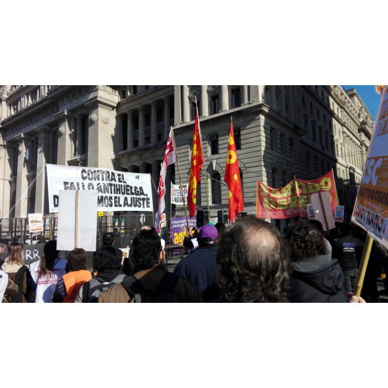 Trabajadores nucleados en gremios de la provincia y la ciudad de Buenos Aires realizaron un acto frente al Palacio de Tribunales con el propósito de manifestar su rechazo al fallo de la Corte Suprema de Justicia de la Nación que, según consideraron, "limita el derecho a huelga sólo a los sindicatos" con personería gremial.