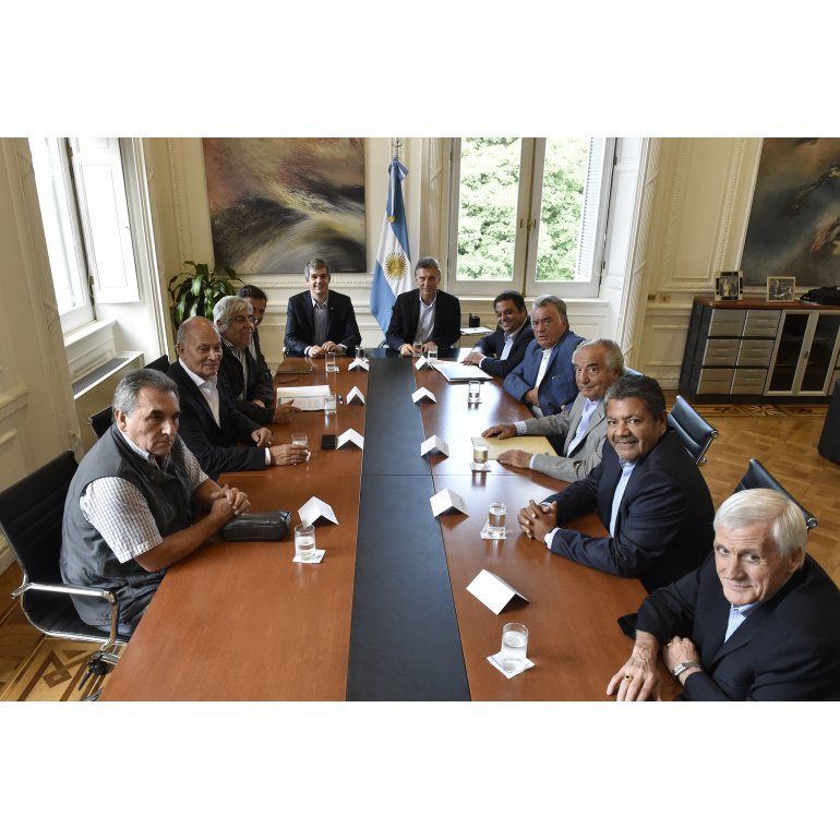 El presidente Mauricio Macri, acompañado por el jefe de Gabinete Marcos Peña y el ministro de Trabajo, Jorge Triaca, recibió en Casa Rosada a los líderes de la CGT Azopardo, Hugo Moyano, al de la CGT Alsina, Antonio Caló, a Luis Barrionuevo (gastronómicos), a Gerónimo 'Momo' Venegas (trabajadores rurales), a Armando Cavalieri (Comercio), a Gerardo Martínez (UOCRA) y a Juan Carlos Schmid (Dragado y Balizamiento).