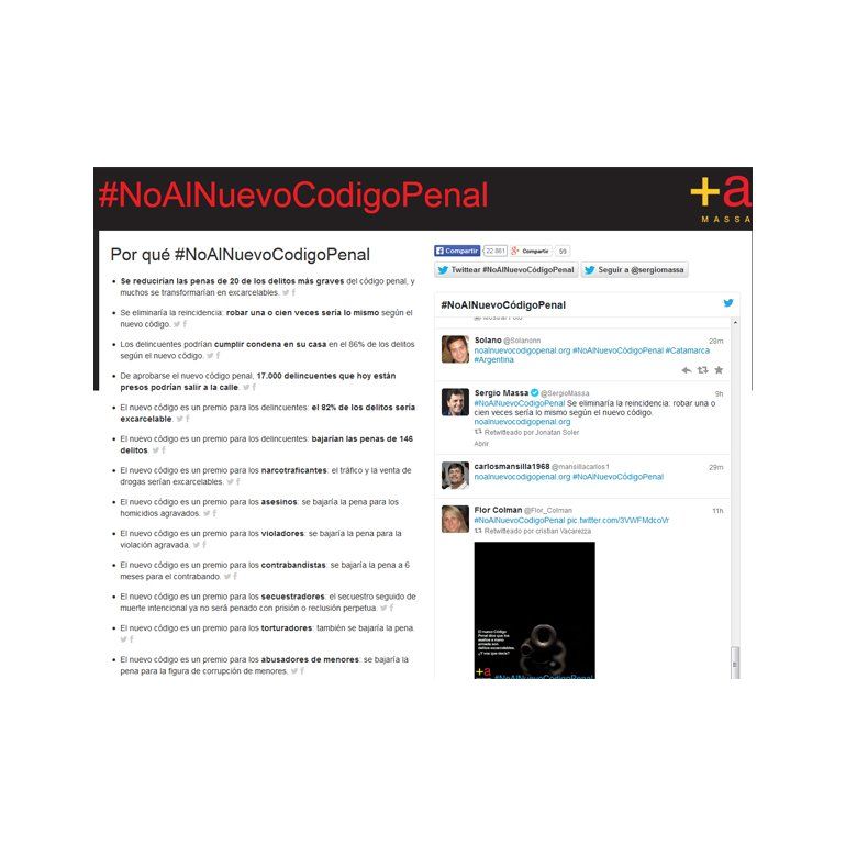 Ahora estrenó un sitio web (www.noalnuevocodigopenal.org) donde expone en 19 ítems las causas por las que hay que decirle no al anteproyecto. Entre ellas, se destacan varias de las que ya expuso en los medios, como la reducción de las penas en los delitos más graves y la eliminación de la reincidencia.