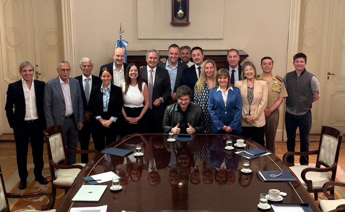 También asistían el asesor presidencial, Santiago Caputo; el titular de la Cámara de Diputados, Martín Menem; y el presidente del Banco Central, Santiago Bausili.