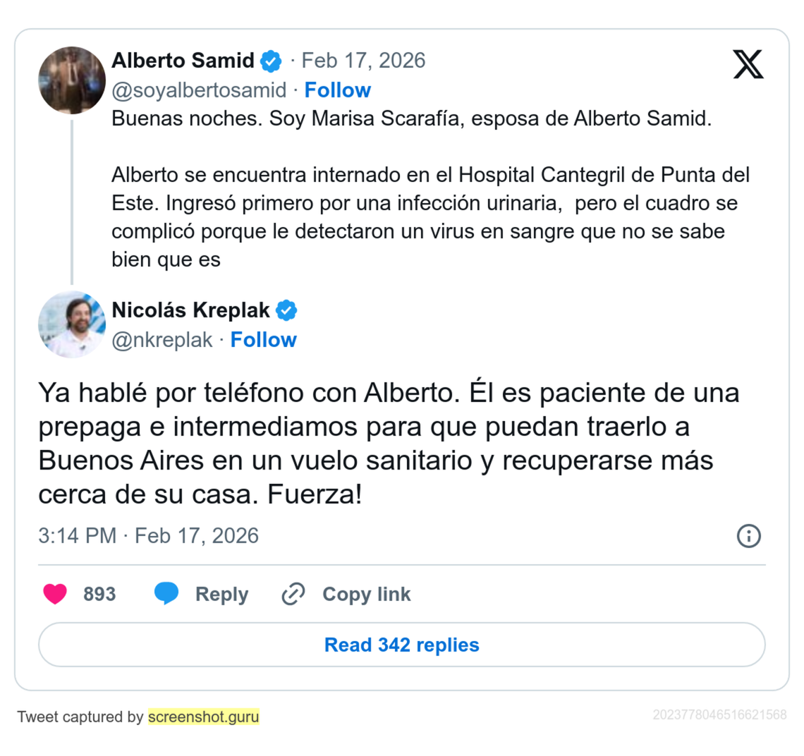 Samid debió ser internado en la ciudad balnearia uruguaya tras sufrir un cuadro de infección urinaria, pero su situación se agravó porque le detectaron la presencia de un virus raro.
