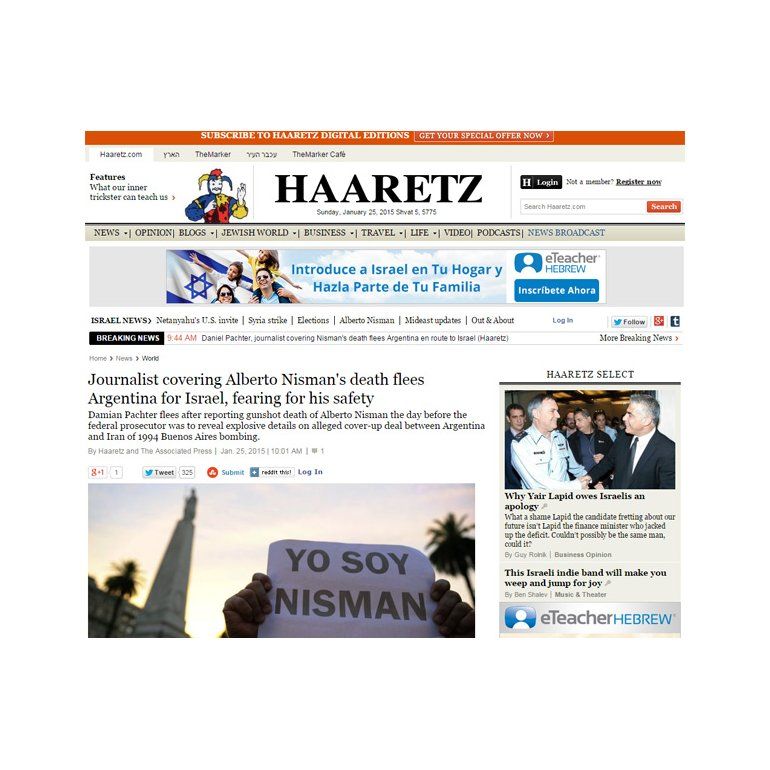 El periodista argentino Damián Pachter, el primero en informar sobre la muerte del fiscal Alberto Nisman, arribó en la tarde del domingo a Tel Aviv, donde permanecerá, según indicó, refugiado por cuestiones de seguridad.
