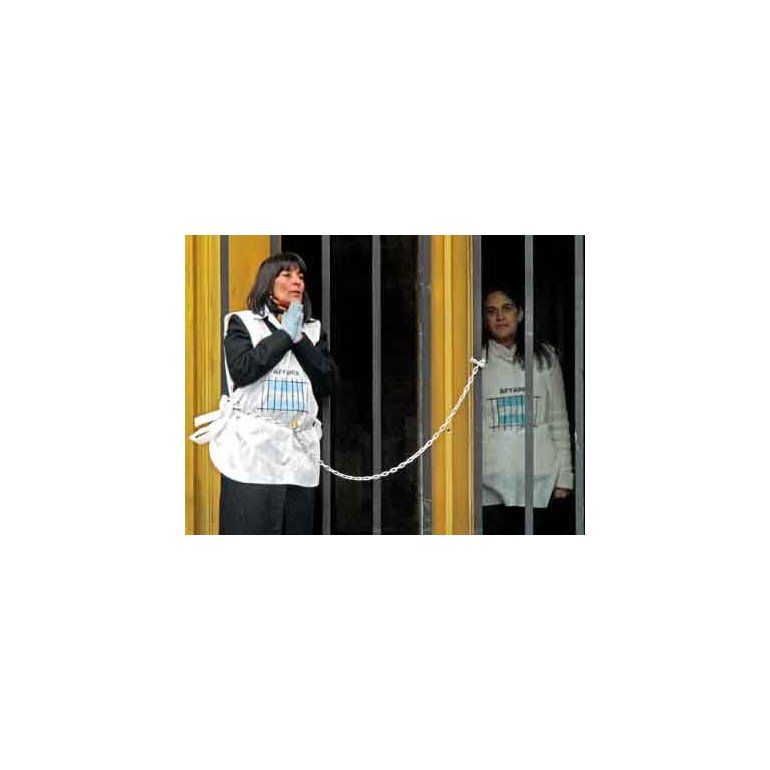Cecilia Pando, militante a favor de acusados por violaciones a los derechos humanos durante la última dictadura, se encadenó ayer por varias horas en el Edificio Libertador, sede del Ejército y del Ministerio de Defensa, y luego de ser desalojada por orden judicial se instaló frente al edificio a la espera de una entrevista con la ministra Nilda Garré.