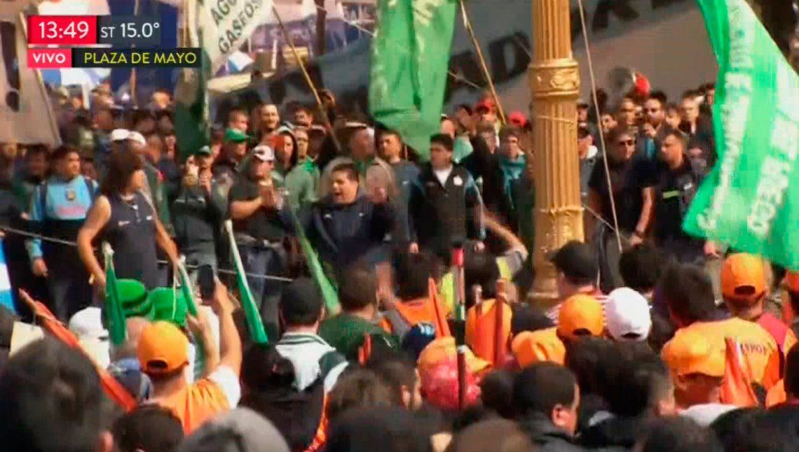 Un grupo de manifestantes pertenecientes al gremio Camioneros se pegaron con botellas y palos frente al escenario de la CGT en la Plaza de Mayo, en el marco de la masiva protesta contra el gobierno nacional.