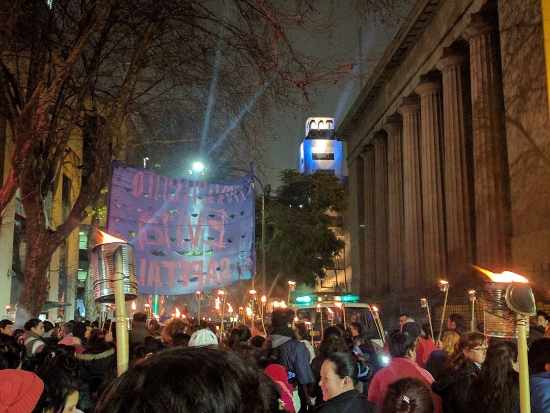 El Frente por el Trabajo y la Dignidad Milagro Sala llegó anoche a la sede del Ministerio de Desarrollo Social para sumarse a la marcha de antorchas en homenaje a Evita, en una movilización de la que participaron también trabajadores despedidos de Pepsico y Atucha y la presidenta de Madres de Plaza de Mayo, Hebe de Bonafini.