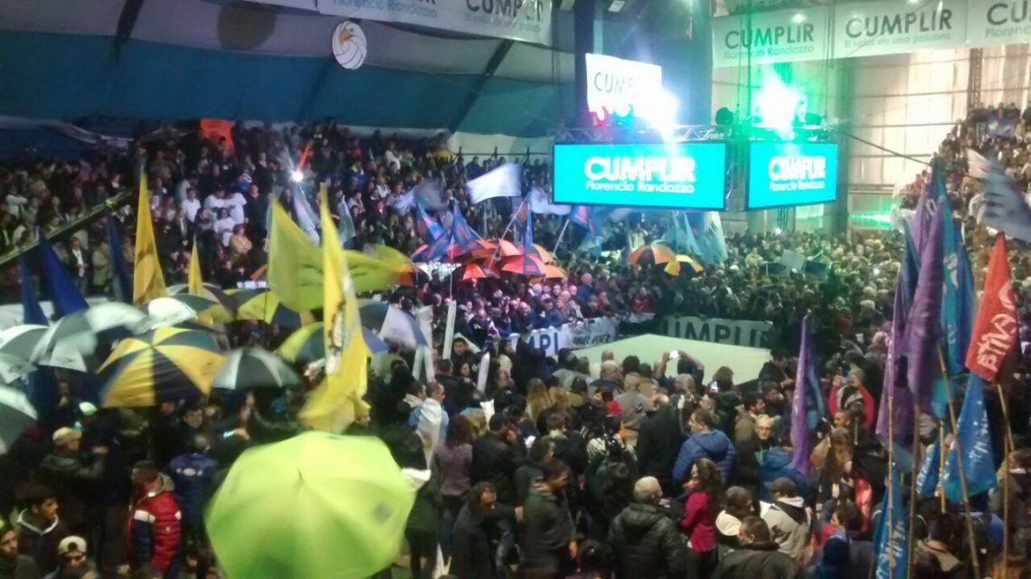 En la puerta del estadio hay pintadas que quedaron de otra elección. “Gracias Néstor y Cristina por tanto”, reza una. También otras dedicadas a la Ley de Medios y a La Cámpora. A metros nada más, dentro del estadio, Florencio Randazzo habló de avanzar: “Venimos de un peronismo que no solo canta la marcha, sino que se actualiza”. Y levantó el estadio cuando disparó: “Cumplir nace de la rebeldía. La rebeldía frente a la teoría del jefe y la soberbia”.