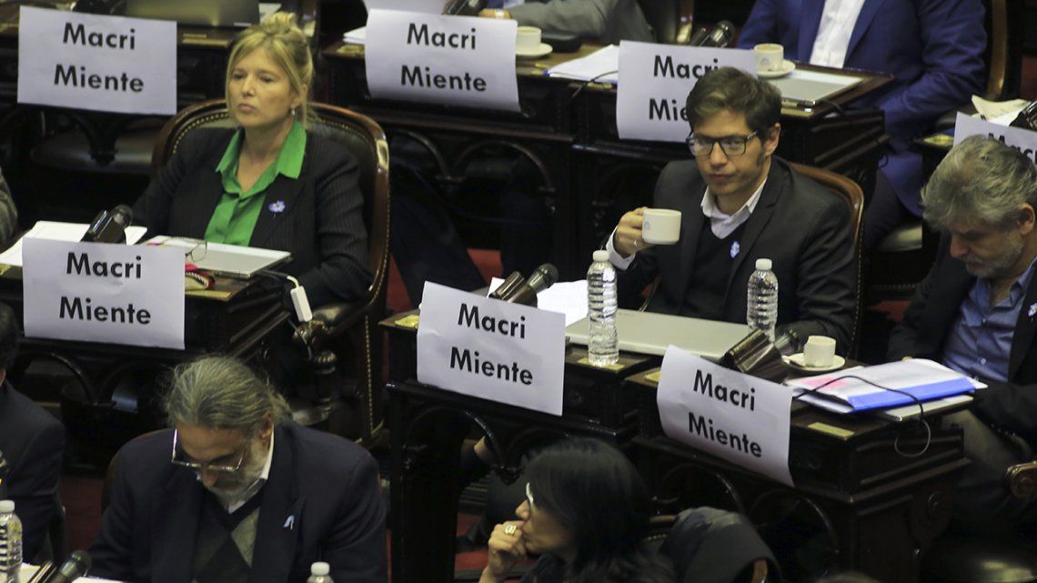 Por su parte, los diputados del bloque del Frente para la Victoria-PJ lo recibieron con carteles colocados sobre sus bancas que decían “Macri miente”.