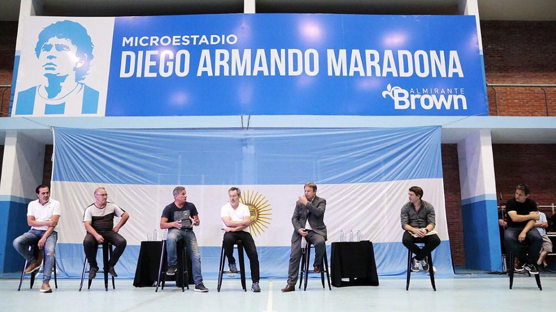 El intendente de Almirante Brown, Mariano Cascallares y los campeones del mundo Héctor (El Negro) Enrique, Julio (El Vasco) Olarticoechea, Carlos Daniel (Chino) Tapia y Sergio (Checho) Batista, encabezaron una emotiva ceremonia durante la cual le impusieron el nombre de Diego Armando Maradona al Microestadio del Polideportivo Municipal de ese distrito bonaerense en homenaje al mejor jugador de fútbol de la historia.